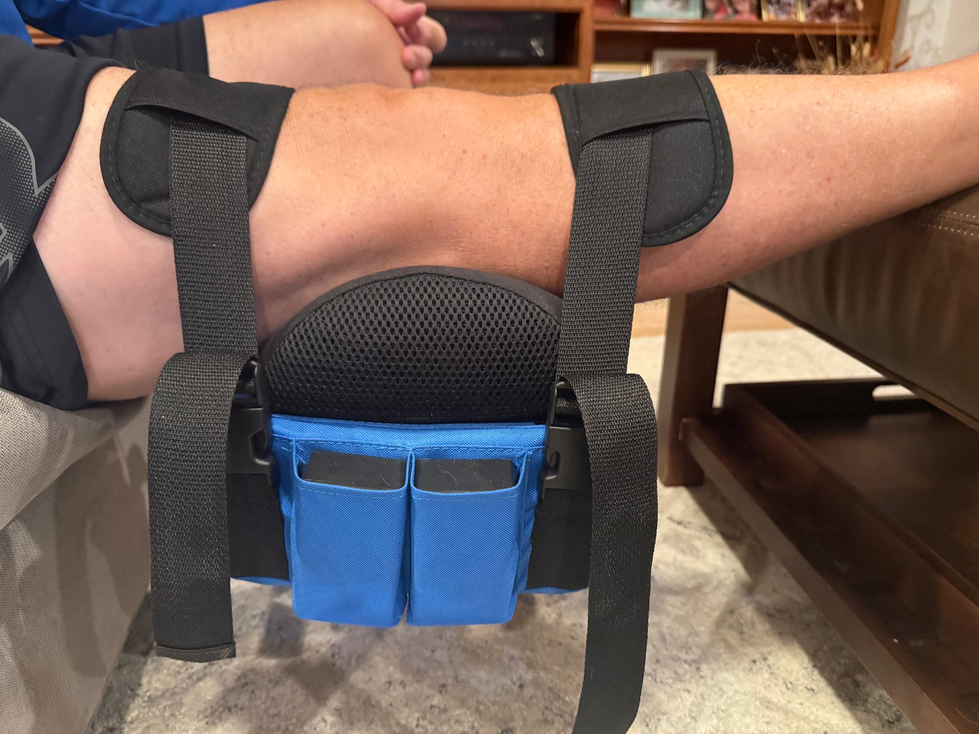 On the outside of the TWC, there are four side release plastic buckle clips positioned at the end of each side of the 10” Length. When each leg strap is engaged into the 1st buckle clip, placed over the leg, and engaged into the 2nd buckle clip, they are positioned approximately 2-3 inches above and below the average sized knee. The two leg straps are constructed with padding to provide comfort against the top of the user’s leg. One strap is positioned over the thigh and one strap is positioned over the shin. The two leg straps are also constructed with cinch straps at each buckle clip location for slow and symmetrical tightening of the straps, carefully pulling the TWC up against the back of the leg and knee.